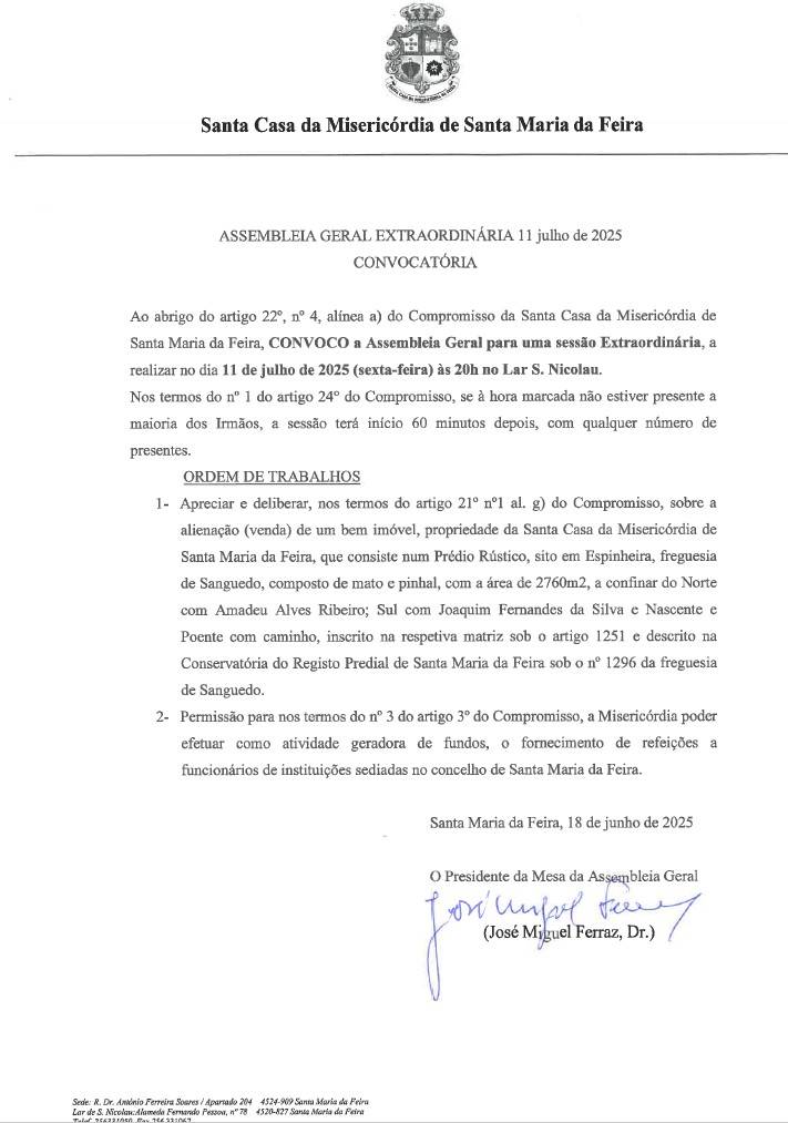 Ao abrigo do artigo 22º, nº 4, alínea a) do Compromisso da Santa Casa da Misericórdia de Santa Maria da Feira, CONVOCO a Assembleia Geral para uma sessão Extraordinária, a realizar no dia 11 de julho de 2025 (sexta-feira) às 20h no Lar S. Nicolau.