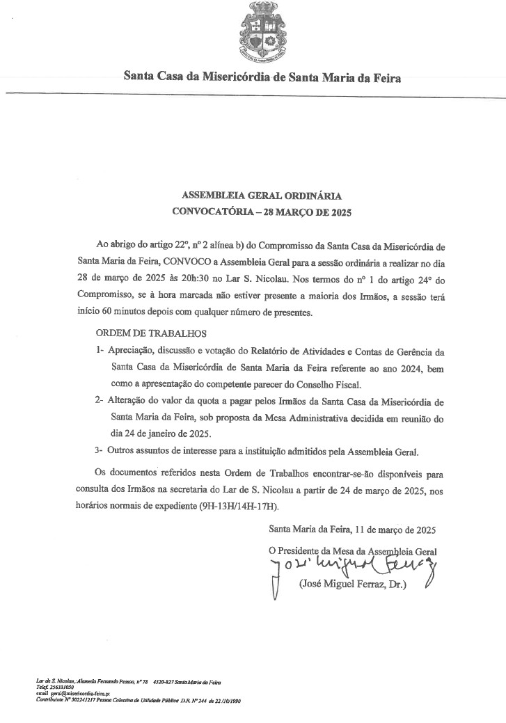 Ao abrigo do artigo 22º, nº 2 alínea b) do Compromisso da Santa Casa da Misericórdia da Santa Maria da Feira, CONVOCO a Assembleia Geral para a sessão ordinária a realizar no dia 28 de março de 2025, com início às 20h:30, no Lar S. Nicolau. Nos termos do nº 1 do artigo 24º do Compromisso, se à hora marcada não estiver presente a maioria dos Irmãos, a sessão terá início 60 minutos depois com qualquer número de presentes.