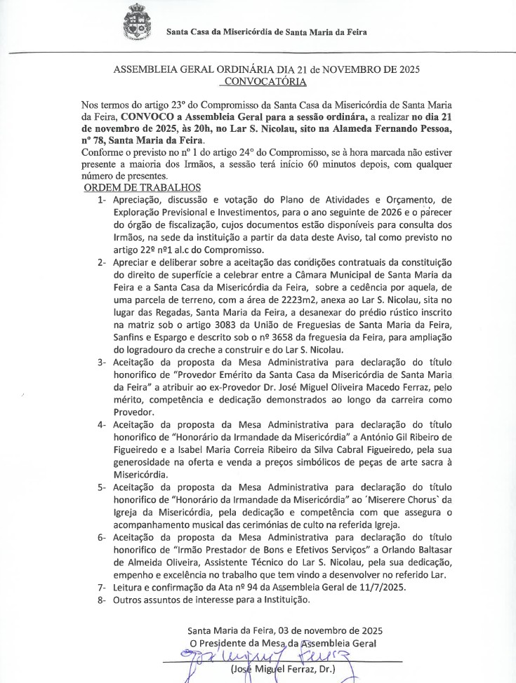 Nos termos do artigo 23º do Compromisso da Santa Casa da Misericórdia de Santa Maria da Feira, CONVOCO a Assembleia Geral para a sessão ordinára, a realizar no dia 21 de novembro de 2025, às 20h, no Lar S. Nicolau, sito na Alameda Fernando Pessoa, nº 78, Santa Maria da Feira.